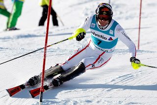 Marcel Hirscher moves inside the arc, feet pulled back and counter balanced.